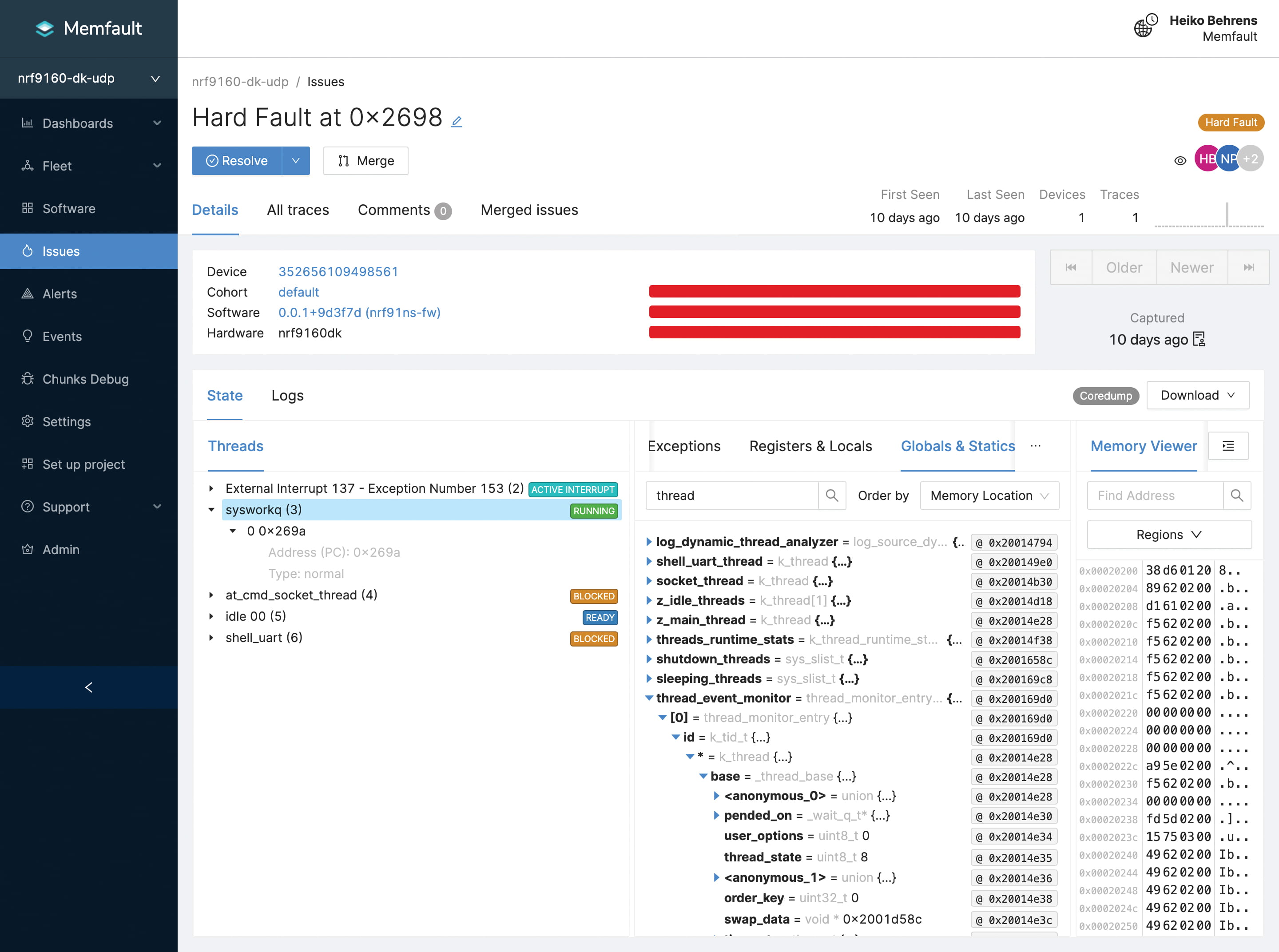Developers using the nRF Connect SDK with the Memfault platform receive notifications directly through the intuitive Cloud portal when a fault occurs. The interface displays the status of the device fleet and detailed reports with tailored diagnostic information for analysis. Memfault’s fault aggregation techniques show the occurrence of a specific fault across the entire population of devices, making developers aware that many issues have the same provenance. The frequency of occurrence, number of affected devices, and fault occurrence timeline can allow developers to identify if, for example, a specific device type or software update could have resulted in a fault and what impact that fault is having. With this information, developers can locate the root cause of the issue and push updates to fix it before end users notice it, at the same time reducing the resolution time from days to minutes and lowering the engineering and support overhead.