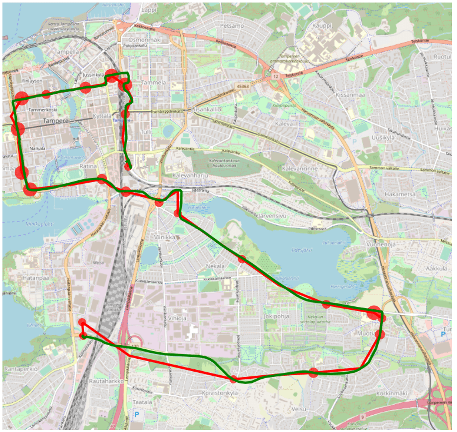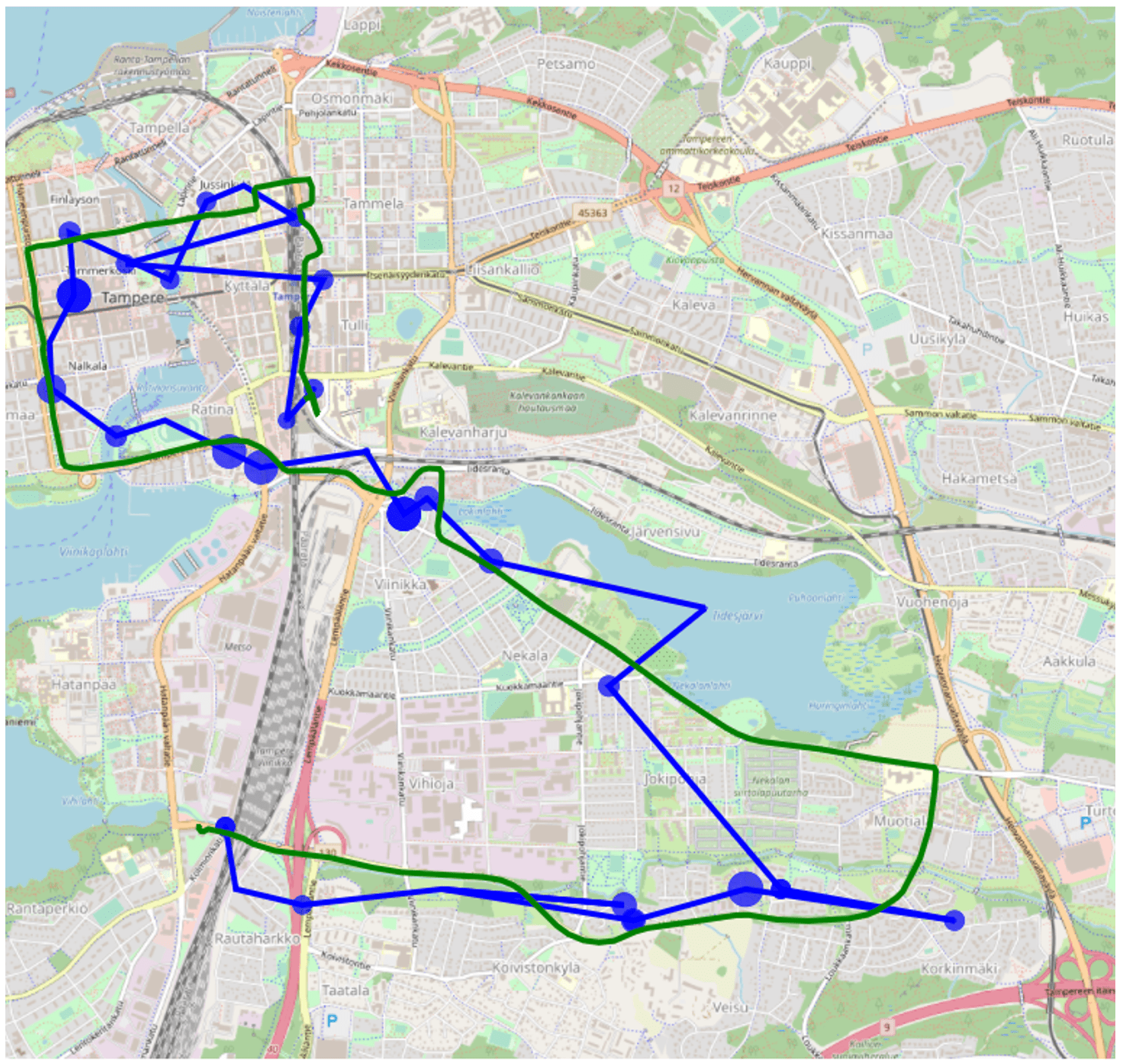 We took a test device out on a ride to get a real world benchmark between these location options. The GNSS tracked path can be considered the most accurate one (in green), and both cell (blue) and Wi-Fi (red) based location is shown.