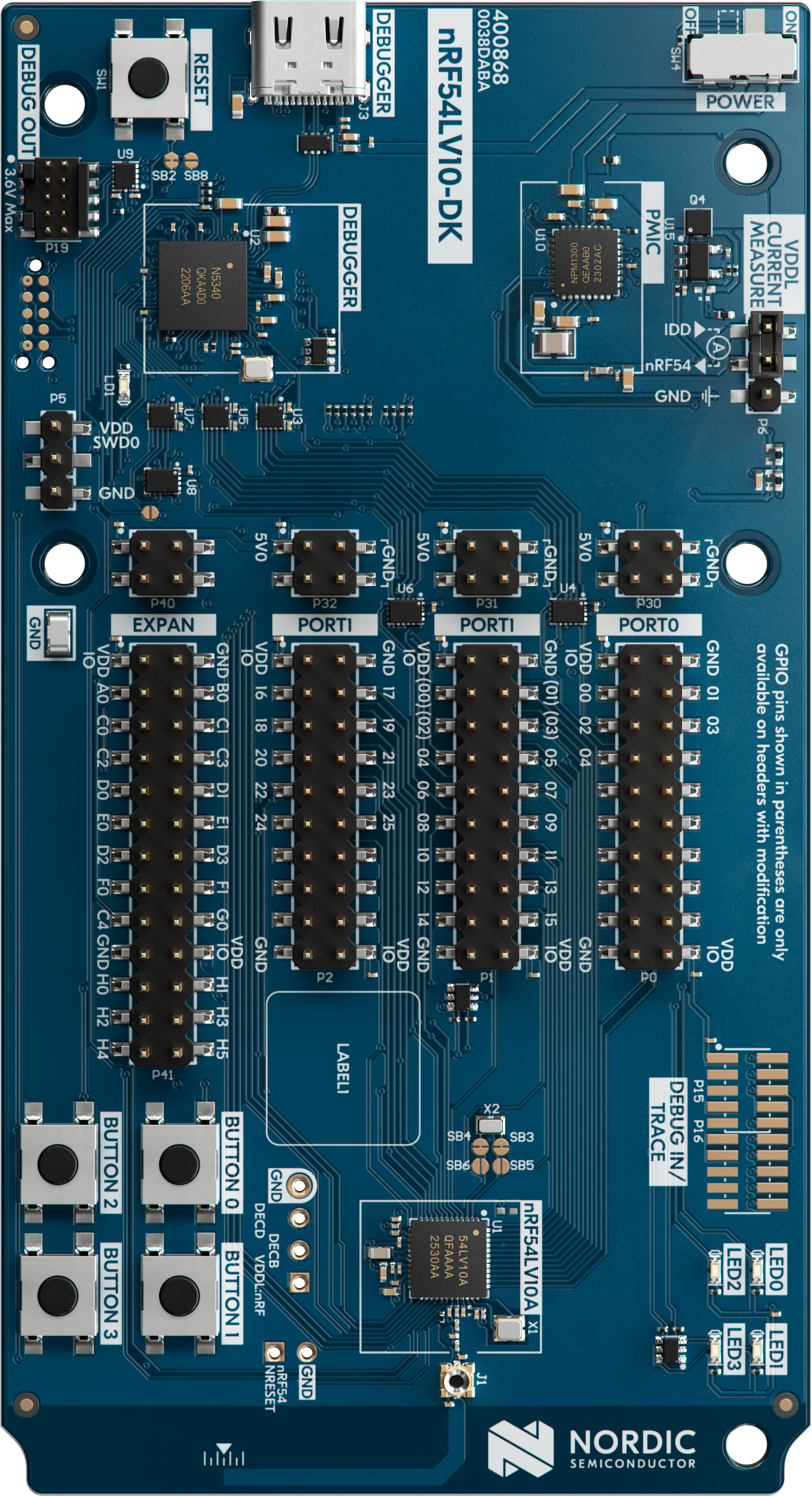 The nRF54LV10 DK is the development kit for the nRF54LV10A, a low-voltage Bluetooth SoC. The affordable single-board development kit makes all features of the wireless SoC available to the developer.