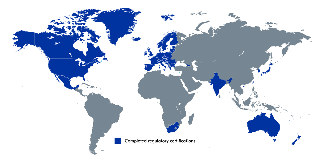 The map below shows completed and ongoing regulatory certifications for the nRF9160 Revision 1 (SIxA-B0) all over the world. Please look here for nRF9160 Revision 2 (SIxA-B1) certifications.