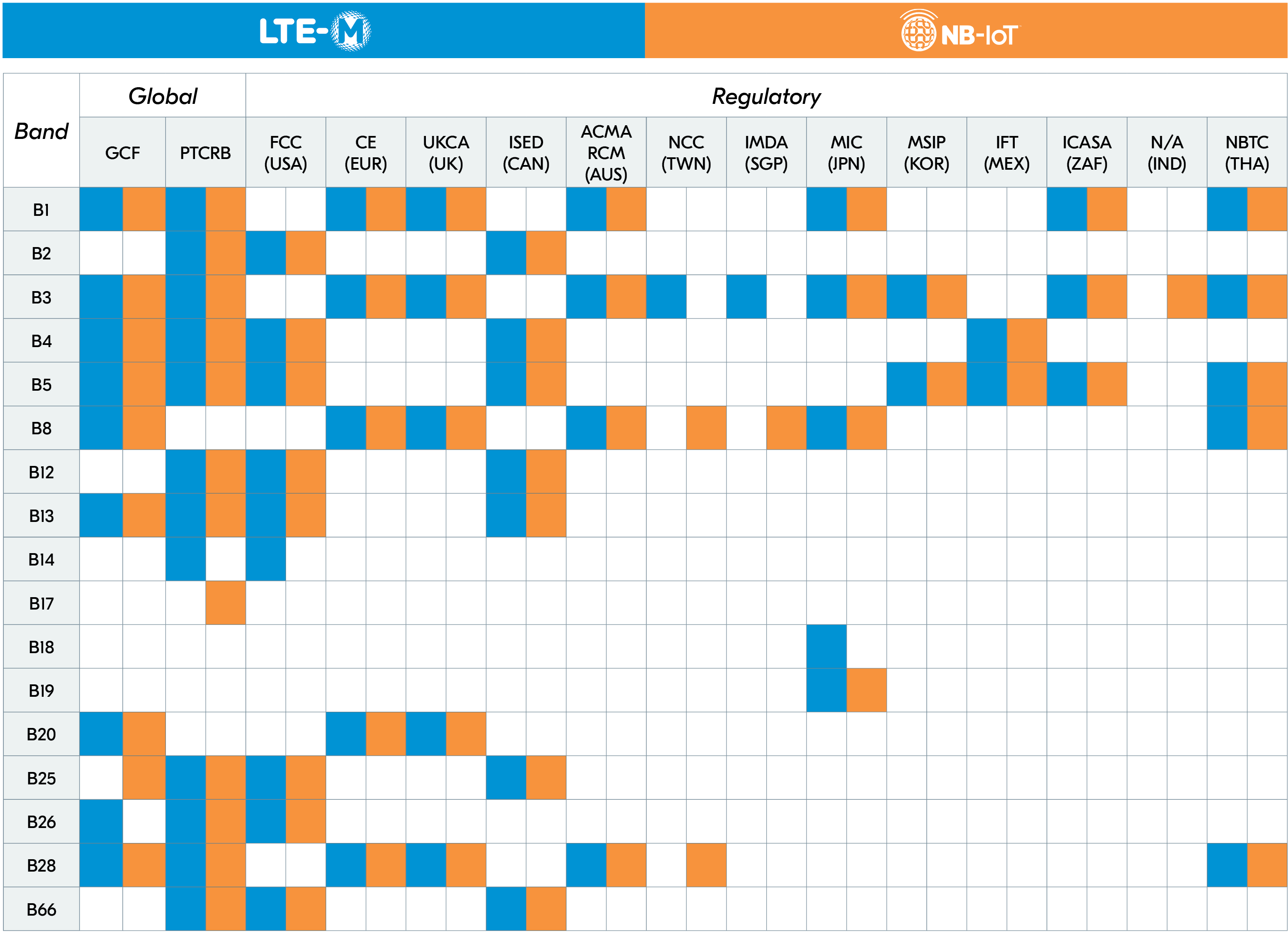 The table below gives an overview of all global (GCF, PTCRB) and regulatory certifications the nRF9160 has for the different LTE bands, for both LTE-M and NB-IoT. Scroll down to see the actual certificates.